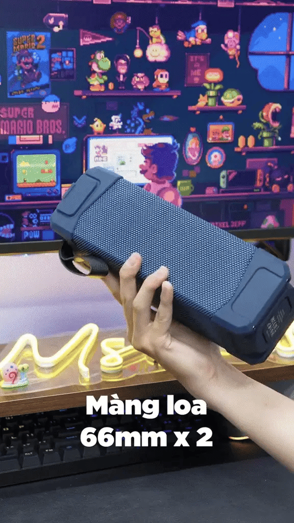 56mm × 2 Speakers (front label) – Delivers dynamic stereo sound with deep bass and clear highs.